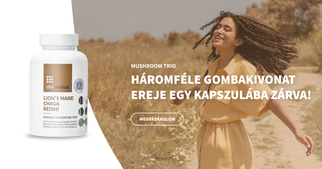 A USA medical Gombatrió kapszula három organikus termesztésből származó gyógygomba – Reishi, Lion’s Mane és Chaga – standardizált kivonatát tartalmazza, természetes acerola-kivonattal kiegészítve, amely a C-vitamin természetes forrása. Ez a széles spektrumú komplex étrend-kiegészítő olyan hatóanyagokat biztosíthat, amelyek támogathatják a szervezet természetes védekezőképességét, a mentális frissességet és a sejtek antioxidáns védelmét.